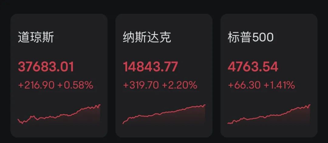 道指涨216.90点,涨幅为0.58%,报37683.01点;纳指涨319.70点,涨幅为2.20%,报14843.77点;标普500指数涨66.30点,涨幅为1.41%,报4763.54点