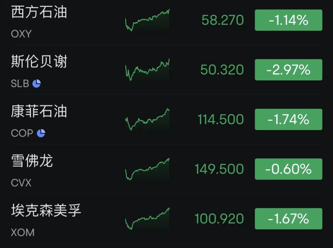 能源股全线走低,埃克森美孚跌1.67%,雪佛龙跌0.60%,康菲石油跌1.74%,斯伦贝谢跌2.97%,西方石油跌1.14%。