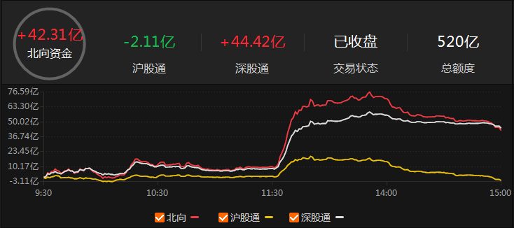 北向资金午后大幅涌入,全天净买入42.31亿元,其中沪股通净卖出2.11亿元,深股通净买入44.42亿元。